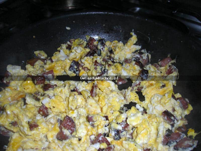 Do mięsa dodać sól, pieprz, trochę wody i drobno pokrojoną cebulę, po czym usmażyć na maśle, a następnie zalać roztrzepanymi jajkami i wstawić do piekarnika na 3-5 minut. Podać danie w naczyniu, w którym było przygotowywane.