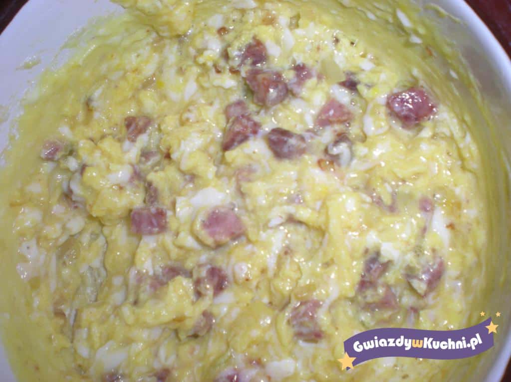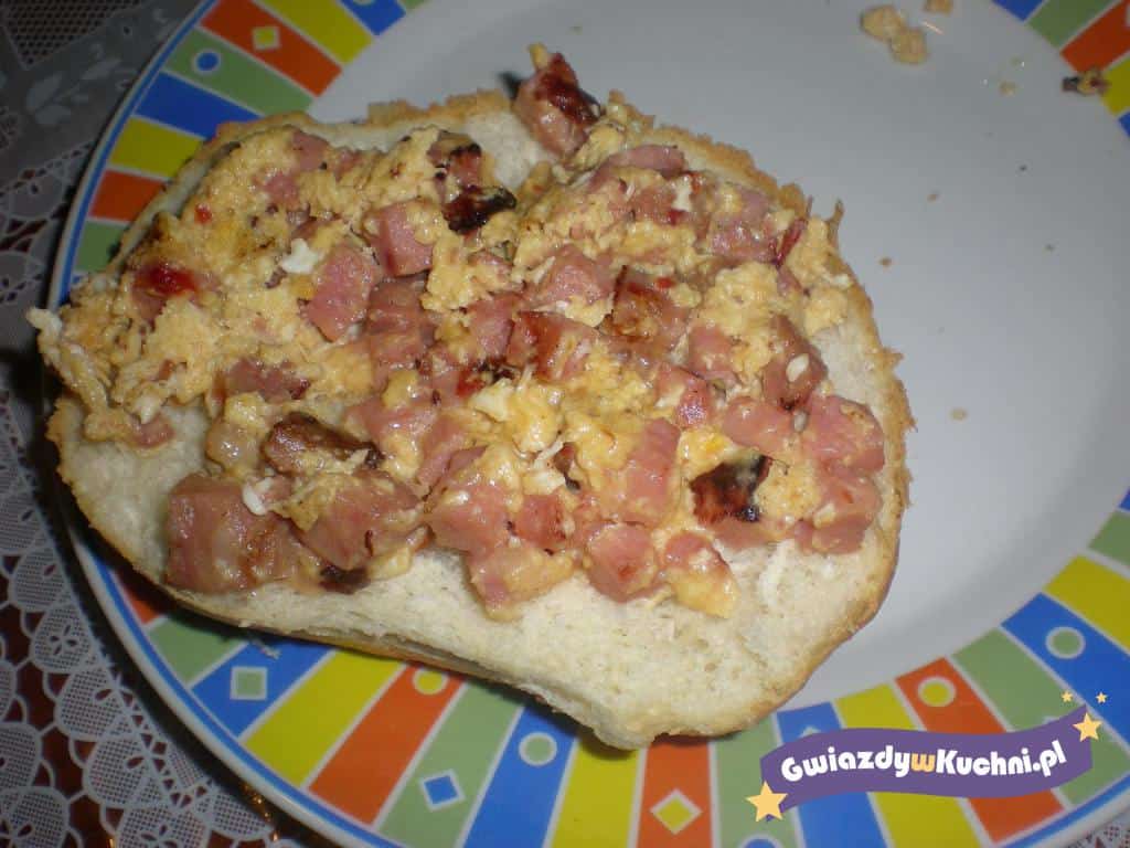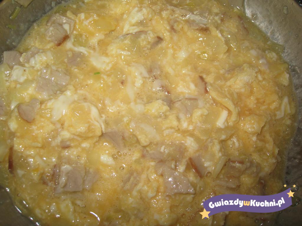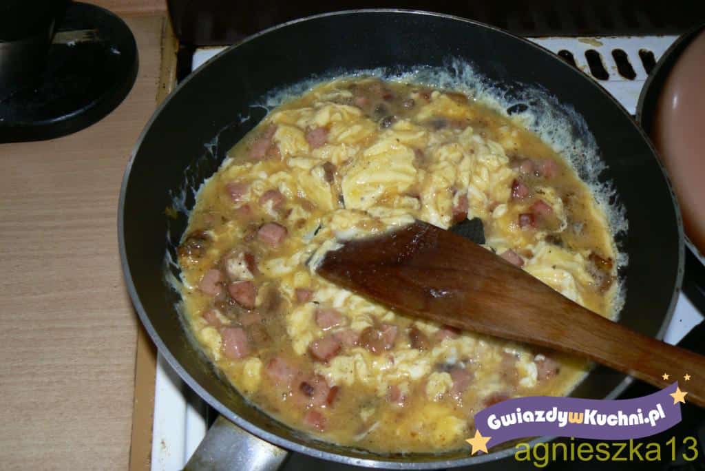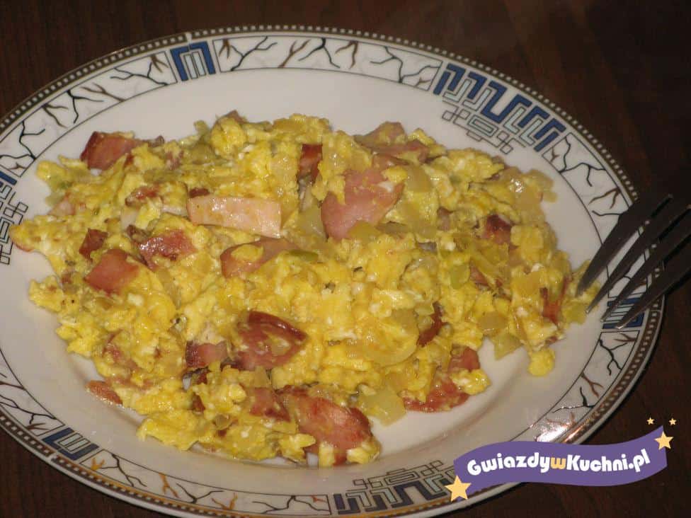 Jajka roztrzepać. Szynkę pokroić w plasterki i podsmażyć, dodać pokrojona w kostkę cebulę. Wlać jajka i przyprawić.