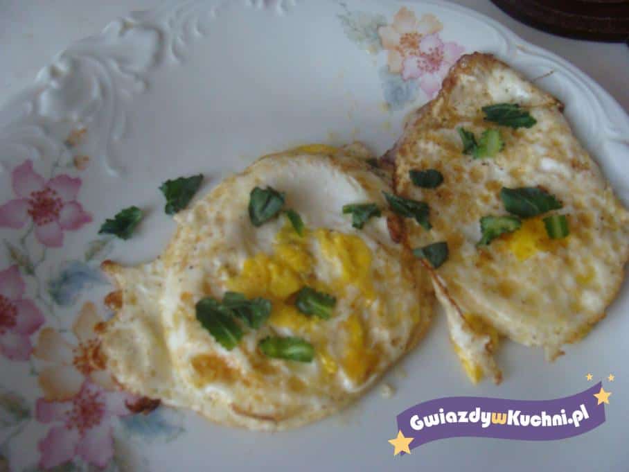 Smalec roztapiamy na patelni. Ostrożnie wybijamy jajka, solimy. Smażymy do ścięcia białka. Wykładamy na talerz. Posypujemy poszatkowaną bazylią.