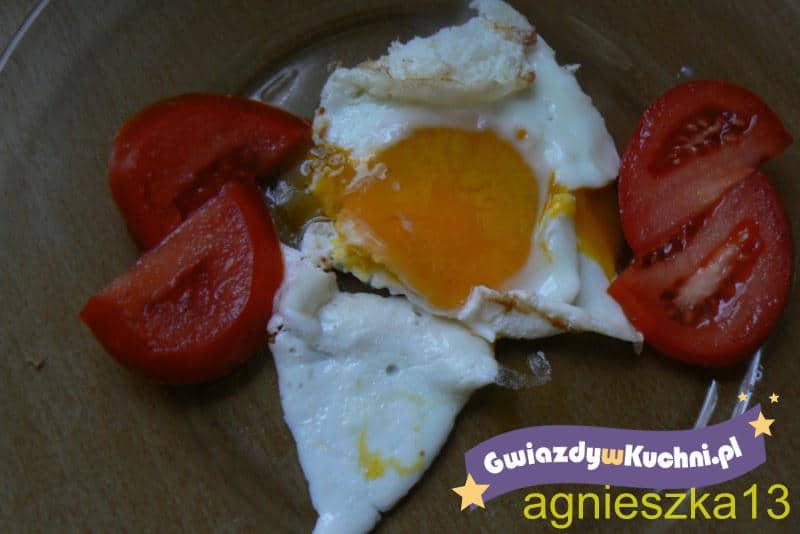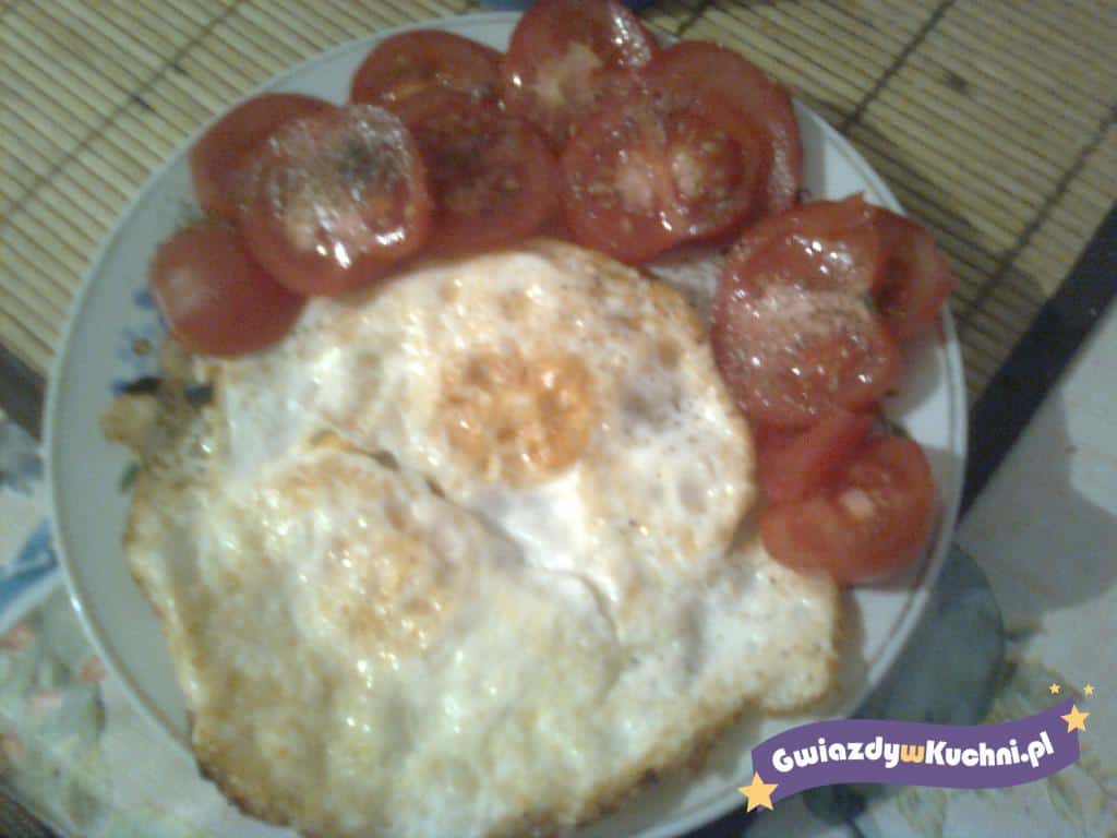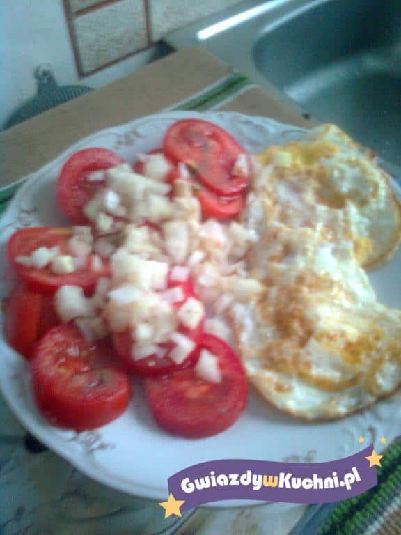Pomidory pokroić w plastry. Cebulę obrać pokroić w kostkę. Tłuszcz rozgrzać na patelni, wbić jajka, posolić usmażyć sadzone. Na talerzu ułożyć jajka sadzone i pomidory. Pomidory obsypać cebulką, solą i pieprzem.