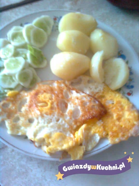 Ziemniaki obieramy, myjemy i gotujemy w osolonej wodzie. Jajka rozbijamy na patelni, solimy oraz pieprzymy do smaku i smażymy do momentu, aż jajka się zetną. Podajemy gorące z ziemniakami.