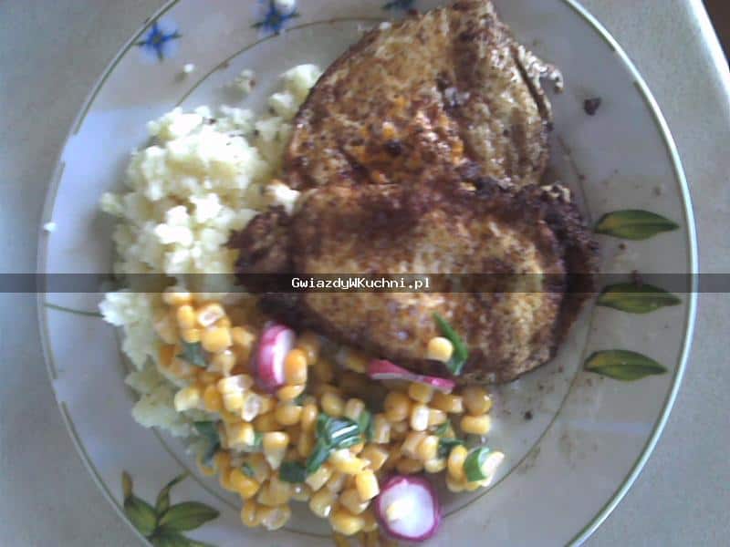 Jajeczka smażymy na rozgrzanej patelni, przyprawiamy do smaku pieprzem i solą. Młode ziemniaki gotujemy w osolonej wodzie. Kukurydzę odsączamy. Wszystkie składniki wykładamy na talerz i gotowe. Smacznego.