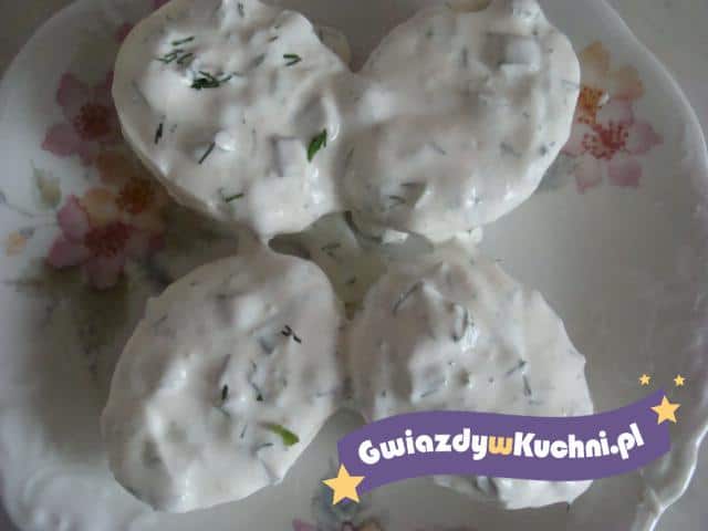 Jajka ugotować na twardo i obrać ze skorupek. Sos biały przygotować wg przepisu na opakowaniu, a następnie dodać powoli śmietanę i pieprz, intensywnie mieszając, i starając się nie dopuścić do gotowania się sosu. Na końcu dodać pokrojony koperek. W tak przygotowanym sosie umieścić jajka.