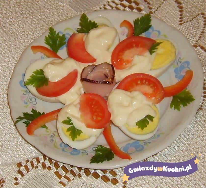 Jajka ugotować na twardo, wystudzić, obrać, przekroić wzdłuż na połowy, oprószyć solą i pieprzem. Jajka ułożyć na półmisku, na każdą połówkę jajka kłaść 1 łyżeczkę majonezu i plaster pomidora.