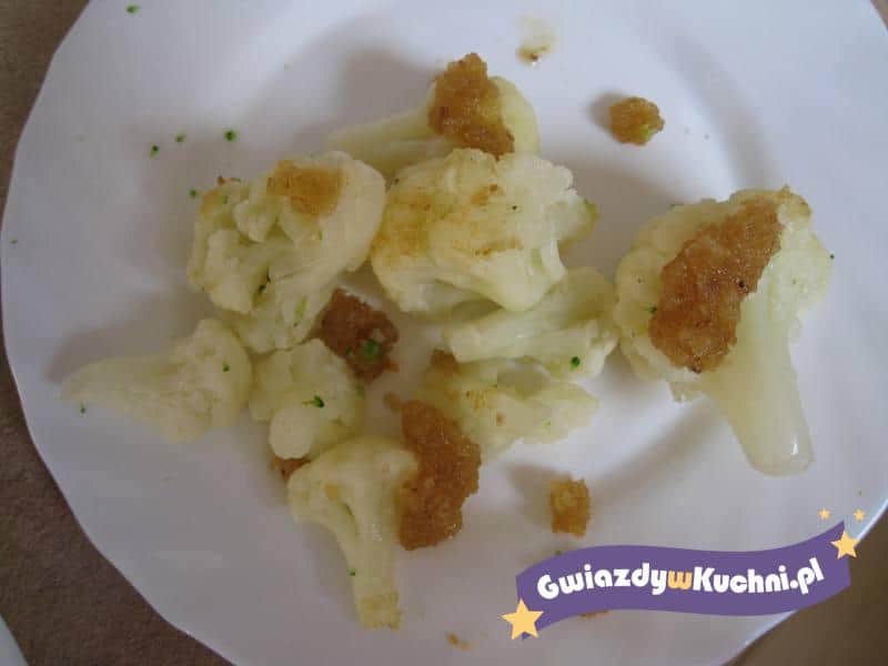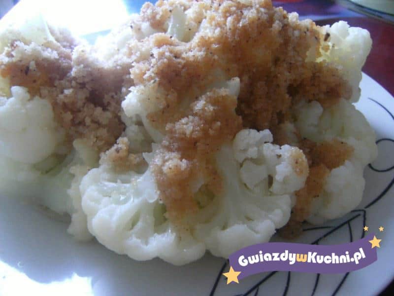 Kalafior odgotowujemy w wodzie. Następnie dzielimy na mniejsze różyczki, taczamy w bułce tartej, posypujemy solą. Masełko wykładamy na patelnię, podsmażamy kalafiora na złoty kolor.