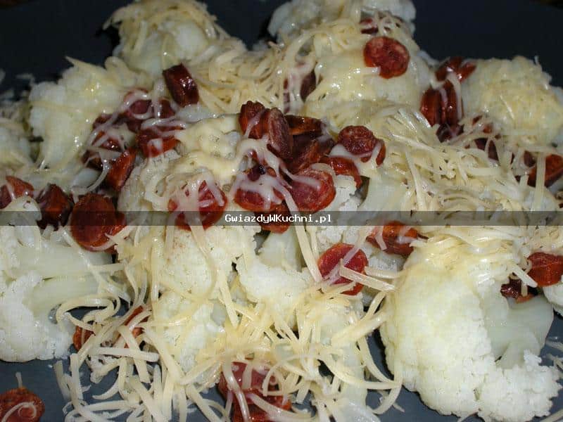 Uparowany kalafior rozłożyć na talerze, posypać plasterkami kabanosów i posypać serem.