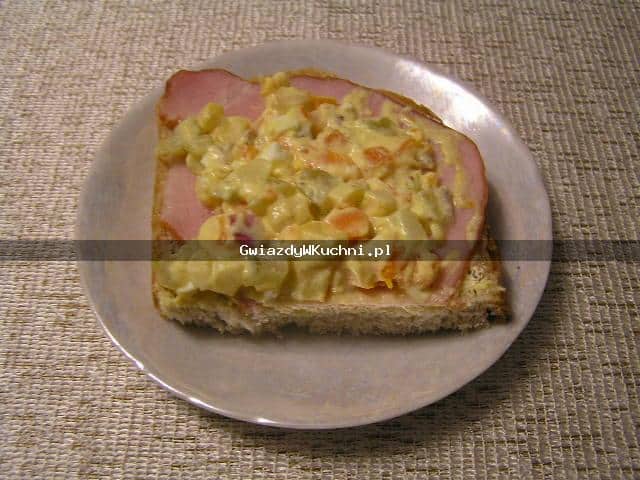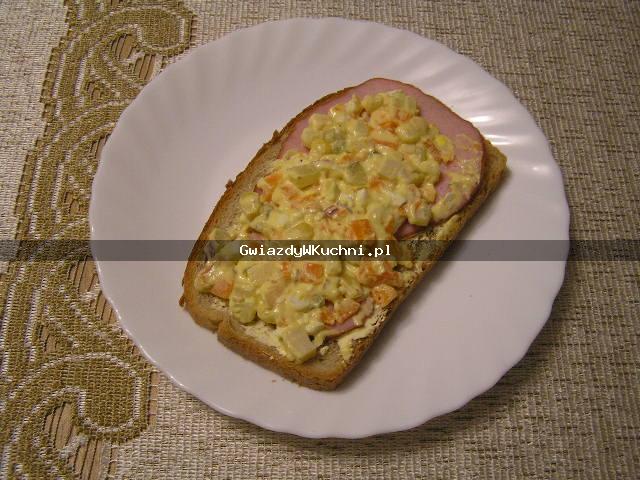 Chleb posmarować masłem, ułożyć plastry polędwicy, a na to łyżkę warzyw gotowanych z majonezem.