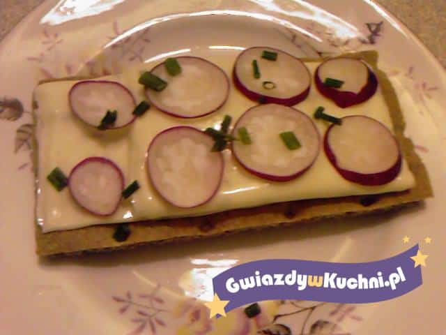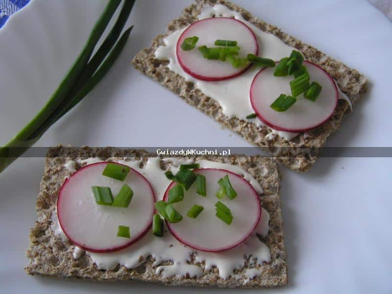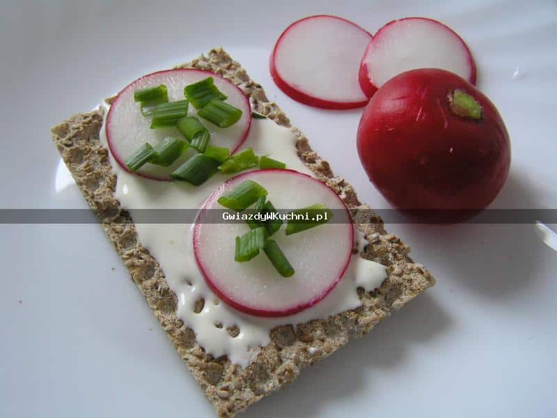 Rzodkiewkę oczyszczamy i kroimy w plasterki. Na pieczywie chrupkim układamy serek topiony. Na koniec posypujemy posiekanym szczypiorkiem