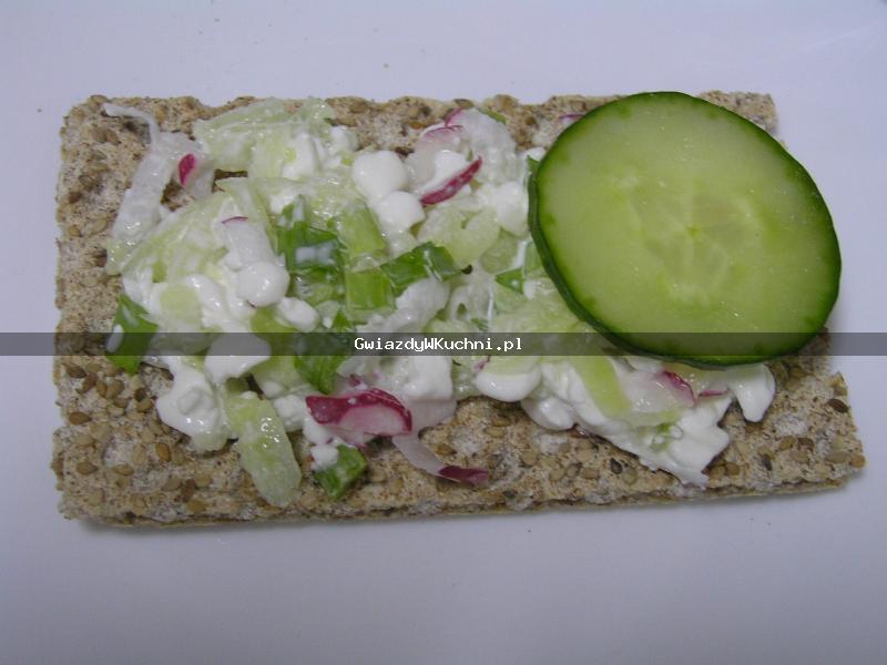 Twaróg wymieszać z jogurtem naturalnym, szczypiorkiem i koperkiem. Pieczywo posmarować twarogiem. Przyozdobić ogórkiem i rzodkiewką, posypać z wierzchu koperkiem.
