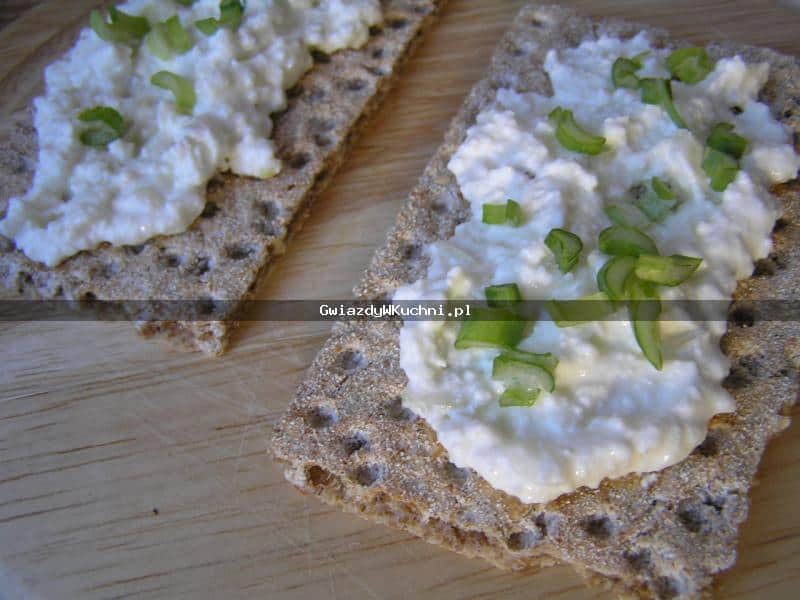 Twaróg wymieszać z jogurtem, dodać sól, cebulę pociętą w drobną kostkę. Szczypiorek drobno posiekać. Na kromkach pieczywa rozsmarować twaróg, posypać szczypiorkiem.