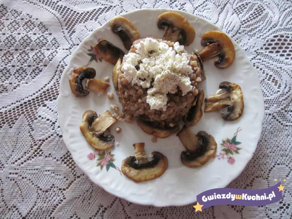 Kaszę gryczaną wypłukać. Rozgrzać 2 łyżki oleju, wsypać kaszę gryczaną, mieszać, smażyć ok 2 minut. Następnie zalać kaszę gorącym bulionem. Gotować na wolnym ogniu pod przykryciem do wchłonięcia się płynu. Pozostawić jeszcze 15 minut pod przykryciem. Pieczarki oczyścić, pokroić w plasterki. Rozgrzać 3 łyżki oleju na patelni, usmażyć pieczarki. Oprószyć do smaku solą oraz pieprzem. Rozłożyć kaszę na talerze, posypać pokruszonym białym serem. Ser oprószyć solą oraz pieprzem do smaku. Rozłożyć smażone pieczarki.