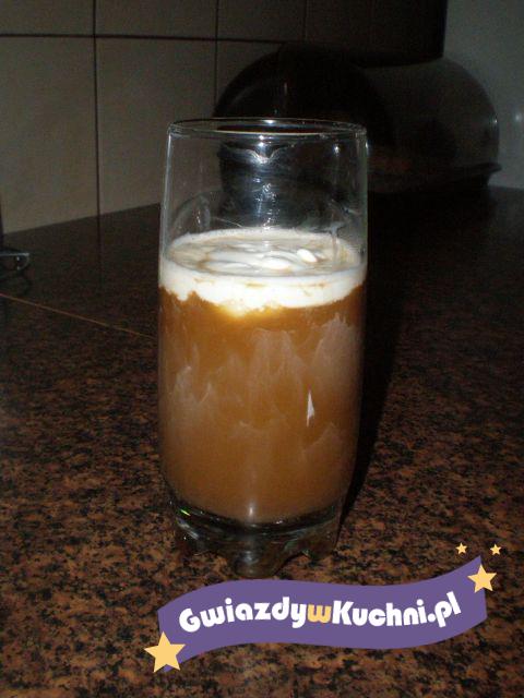 Na dno szklanki wrzucić czekoladę, następnie wsypać kawę i zalać wrzątkiem. Śmietanę delikatnie ubić z cukrem pudrem, wyłożyć na kawę. Od razu podawać.
