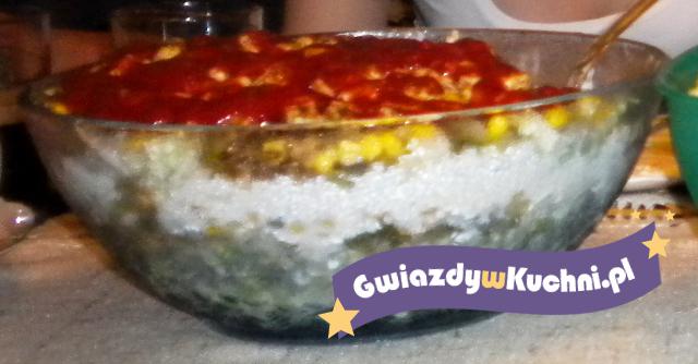 Do naczynia najlepiej szklanego układać warstwami: po połowie pokrojonych składników po kolei – kapustę, cebulę, fasolę, ogórki, kukurydzę i mięso. Pokryć to majonezem i ketchupem, a następnie ułożyć drugą warstwę pozostałych składników w tej samej kolejności. Smacznego 😉