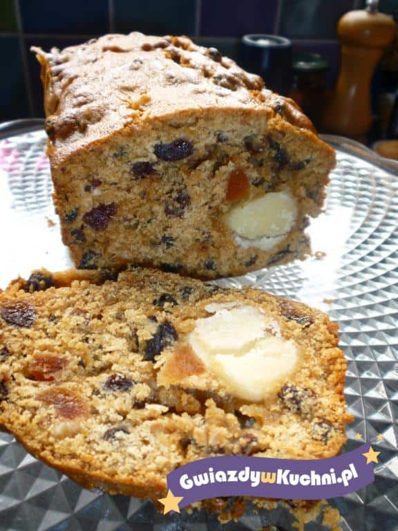 Wymieszać, aż się zrobi jednolite ciasto. Dodać odsączone bakalie, wymieszać i połowę ciasta przełożyć do keksówki. Marcepan ogrzać w rękach i utworzyć rulon na długość keksówki. Wyłożyć na ciasto i przykryć pozostałym wierzch.