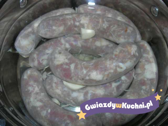 Kiełbasę surową białą ugotować w lekko osolonej wodzie, około pół godziny. Pomidory pokroić w cząstki. Cebulę obrać i pociąć w kostkę. Podawać kiełbaskę na gorąco z pieczywem. Pomidory posypać cebulą, doprawić do smaku solą.