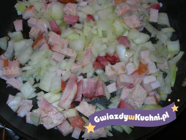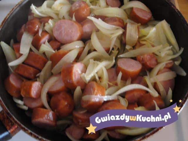Na patelnię wrzucamy pokrojoną w kostkę kiełbasę, podsmażamy, dodajemy posiekaną cebulę, smażymy, aż cebula zmięknie.