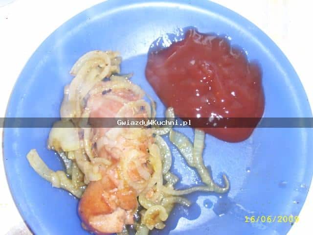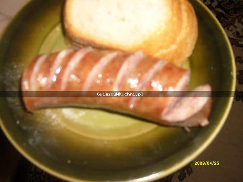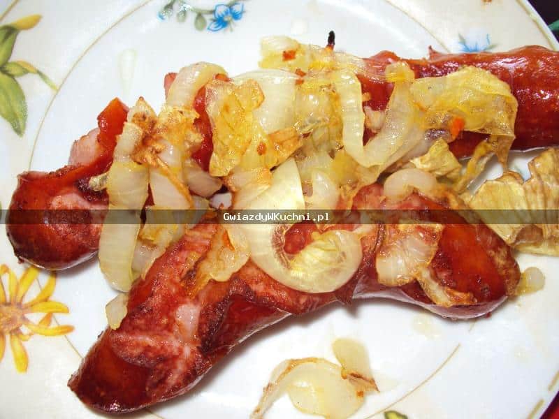 Kiełbaski nacinamy pod zukosem z obu stron. Cebulkę obieramy i kroimy w paseczki. Kiełbaskę pokrojoną podsmażamy na rozgrzanej patelni. Po 3 minutach dodajemy pokrojoną cebulkę.