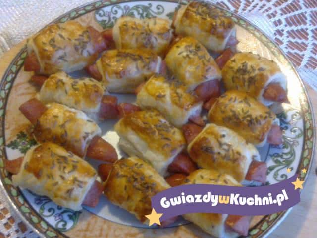 Ciasto rozłożyć na stole, pokroić na paski 3-4 cm i te paski na kwadraty. Kiełbaskę pokroić na dłuższe kawałki o dwa cm. Potem każdy kawałek pokroić na sześć słupków. Kiełbaski ułożyć na kwadratach i dokładnie zawinąć. Każdą porcję kiełbaski posmarować rozmąconym jajkiem i posypać kminkiem. Piec w 200 stopniach przez 15-20 minut.