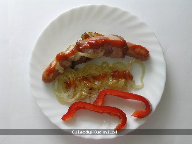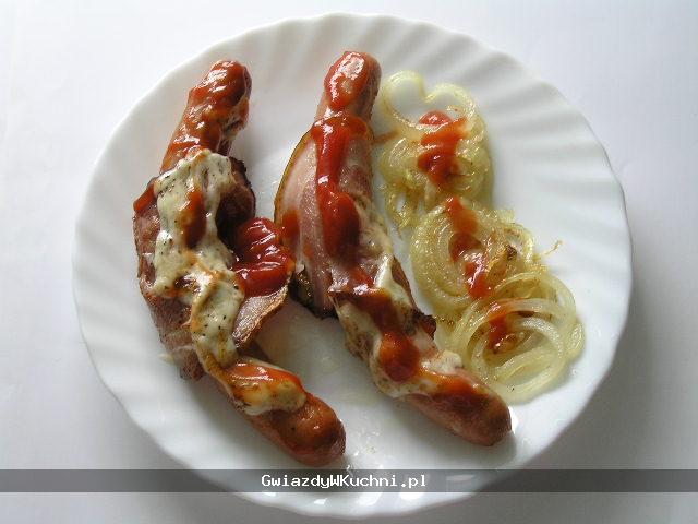Cienkie, długie kiełbaski owinąć plastrami boczku. Zrobić marynatę, łącząc keczup z oliwą. Posmarować marynatą kiełbaski z boczkiem, owinąć plastrami żółtego sera. Piec na rozgrzanym tłuszczu, na złoty kolor.