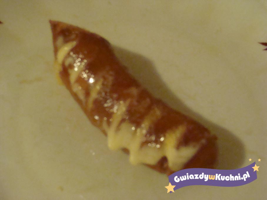 Kiełbasę nacinamy w poprzek z jednej strony. Obsmażamy z naciętej strony. Wyjmujemy z patelni, w nacięcia wkładamy pokrojone wcześniej na kawałki plasterki sera. Wkładamy ponownie na patelnię, przykrywamy aby ser mógł się roztopić. Można polać ketchupem.