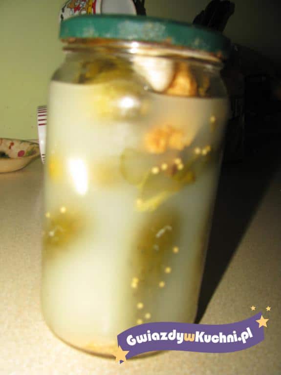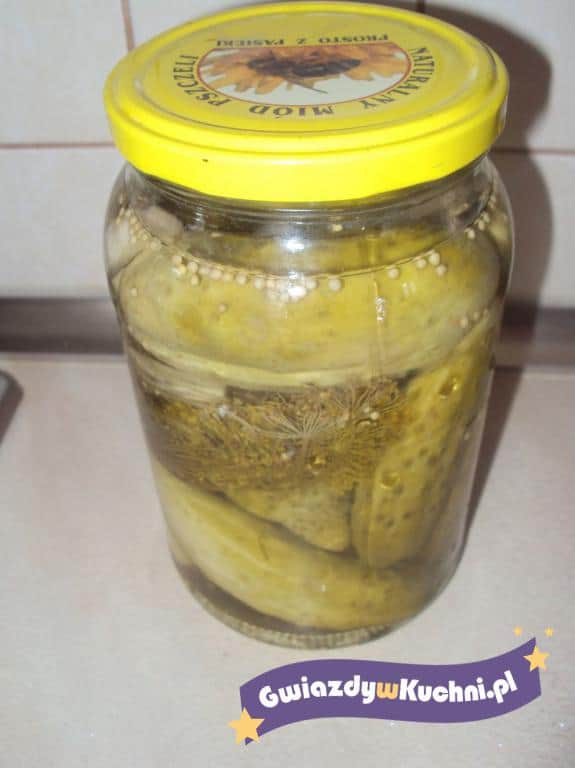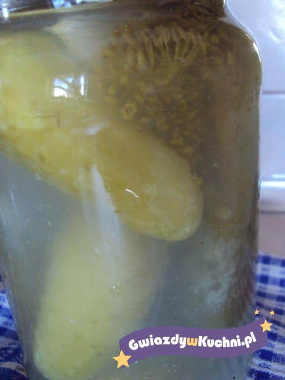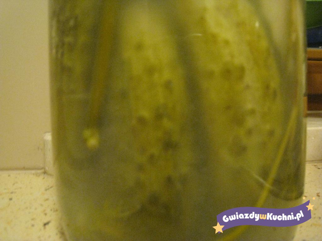 Ogórki dokładnie myjemy, następnie wkładamy ciasno do słoików, dodajemy koper, pieprz, ziele angielskie, liść laurowy, po 1/2 ząbka czosnku i liście dębu, po 1- 2 sztuki na słoik. Wodę mieszamy z solą i zalewamy nią ogórki w słoikach (woda ma być zimna, nie chlorowana, zaś sól tylko KAMIENNA, inaczej ogórki będą kipiały), szczelnie zakręcamy słoiki i odstawiamy w ciemne, chłodne miejsce.