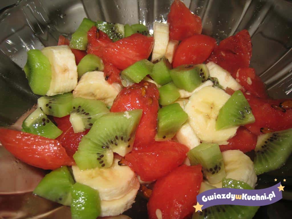 Banana pokroić na plastry, kiwi i arbuza pokroić na kwadraty, polać sokiem ananasowy i brzoskwiniowym i sokiem z arbuza, wszystko razem wymieszać.