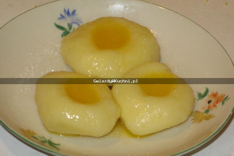 Ziemniaki obrać i ugotować w osolonej wodzie. Ugotowane odcedzić i utrzeć z margaryną i mlekiem. Ostudzić. Do zimnych ziemniaków dodać mąki, jajka i posolić do smaku. Ilość mąki może się różnić, w zależności od konsystencji ciasta. Formować kulki i robić w środku wgniecenie. Gotować do 5 min w lekko osolonej wodzie. Masło roztopić i polać gotowe kluseczki, posypać cukrem