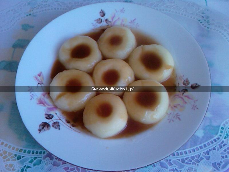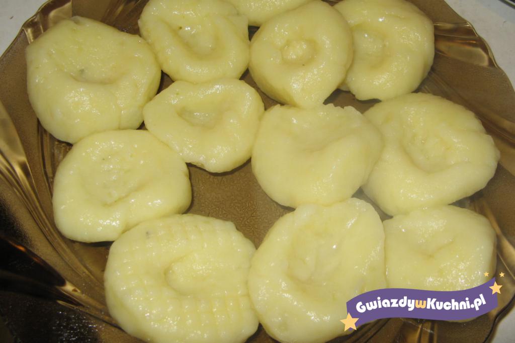 Ziemniaki gotujemy, przeciskamy dwa razy przez praskę, ubijamy w misce. Wyjmujemy 1/4 ziemniaków, w to miejsce wsypujemy na równo mąkę. Dokładamy wyjętą część ziemniaków, zagniatamy. Formujemy wałek, kroimy na równe kawałki i formujemy kuleczki. W każdej kulce robimy wgłębienie. Gotujemy w osolonej wodzie. Podajemy z mięsem i warzywami