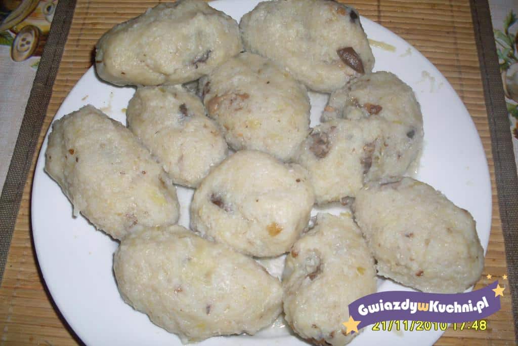 W dłoniach zwilżonych wodą formować okrągłe placki, nakładać na środek trochę farszu i zlepiać podłużne kluski.