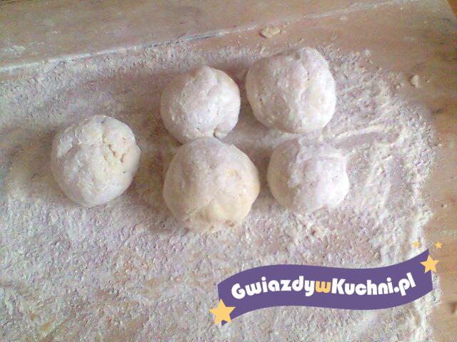 Ziemniaki ugotować z solą i dokładnie ugnieść na ciepło albo przepuścić przez maszynkę do mielenia. Ostudzić,muszą być zimne. Ziemniaki przełożyć na stolnicę, wbić jajko, dodać mąkę, szczyptę soli, zagnieść jednolite ciasto ( żeby ciasto było jak na kopytka).