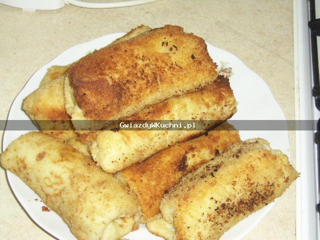 Na środek naleśników nałożyć farsz, uformować krokiety. Każdy naleśnik panierować w lekko ubitym jajku i bułce tartej. Smażyć na rozgrzanym maśle