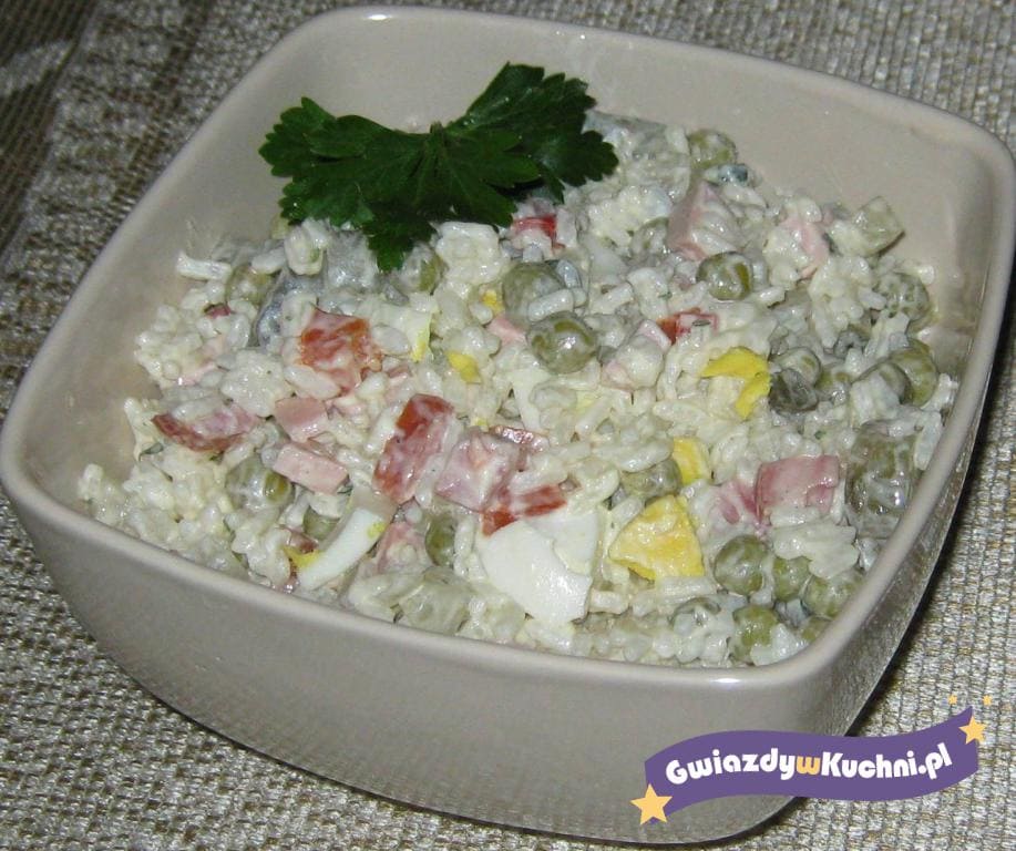 Jajka ugotować na twardo, ostudzić, obrać i pokroić w kostkę. Ogórki i paprykę pokroić w kostkę. Por oczyścić, umyć i drobno pokroić. Wędlinę pokroić w kostkę. Przygotowane składniki połączyć, oprószyć solą i pieprzem. Dodać majonez, wymieszać.