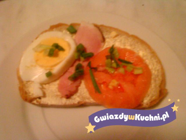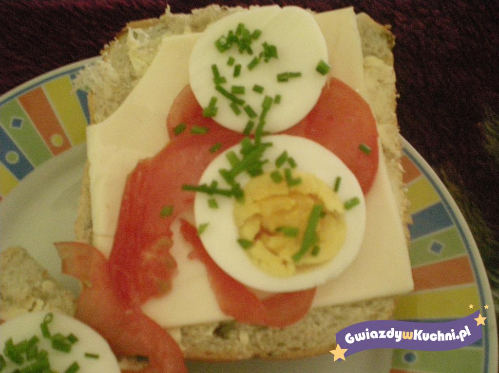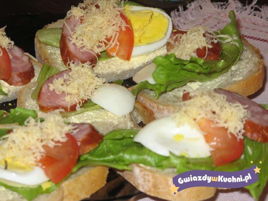 Chleb posmarować masłem. Na każdej kanapce układać liść sałaty, plasterek jajka, kiełbasy i pomidora, na koniec posypać tartym serem.