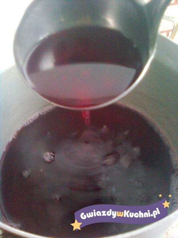 Z wody i cukru ugotować syrop. Wrzącym syropem zalać opłukane owoce.