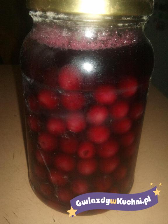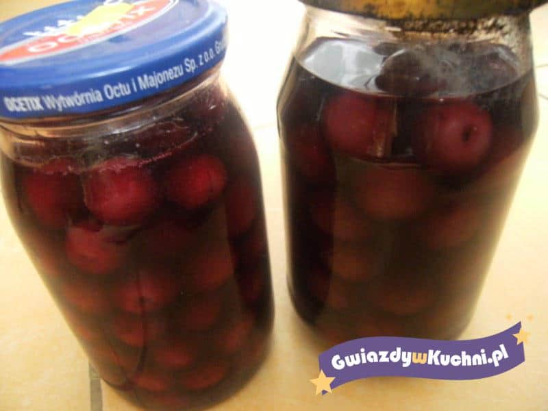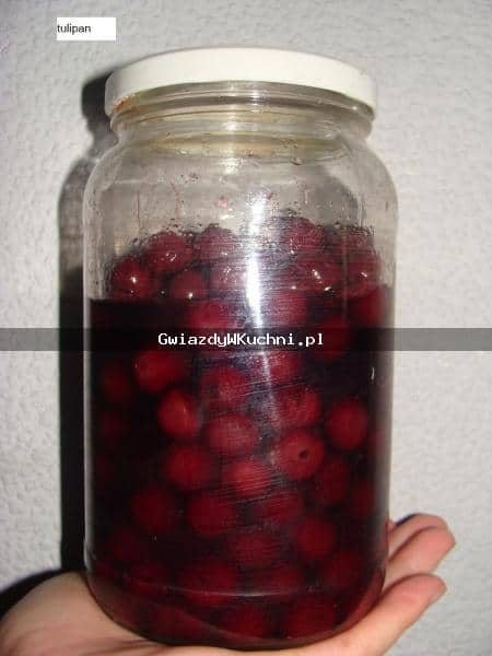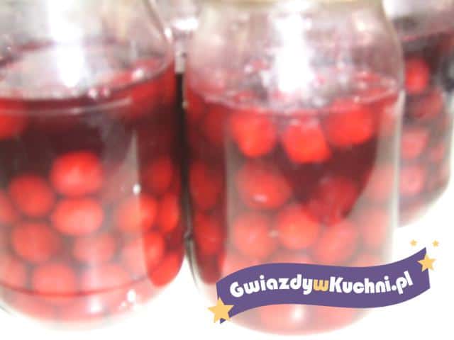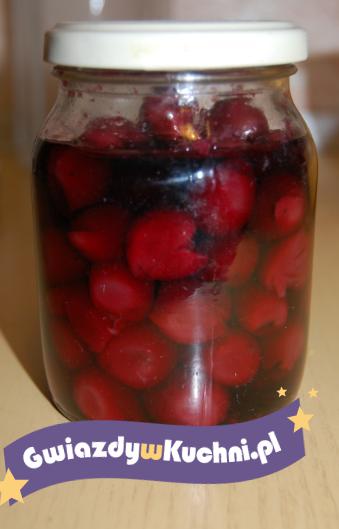 Z wody i cukru ugotować syrop. Wiśnie opłukać, zalać wrzącym syropem i chwilę pogotować.