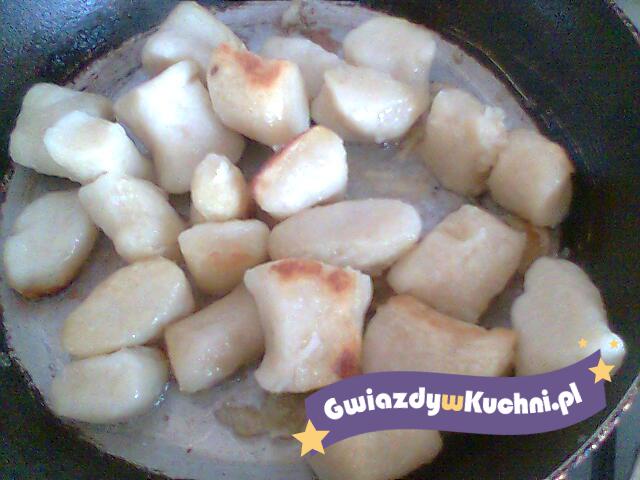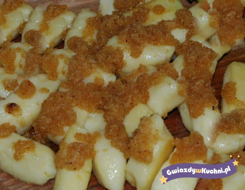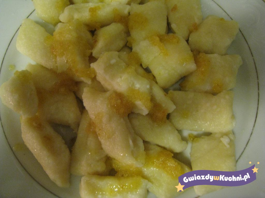 Masło rozpuścić na patelni, dodawać bułkę tarta aż powstanie gęsta masa. Polewać gorące kopytka.