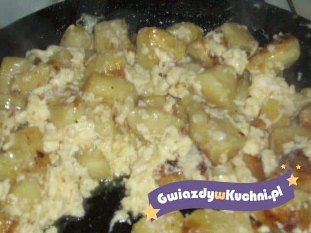 Kopytka podsmażamy na rozgrzanym tłuszczu ( można pokroić na mniejsze kawałki ).Gdy są już chrupiące dodajemy roztrzepane jajka i smażymy razem z kopytkami.