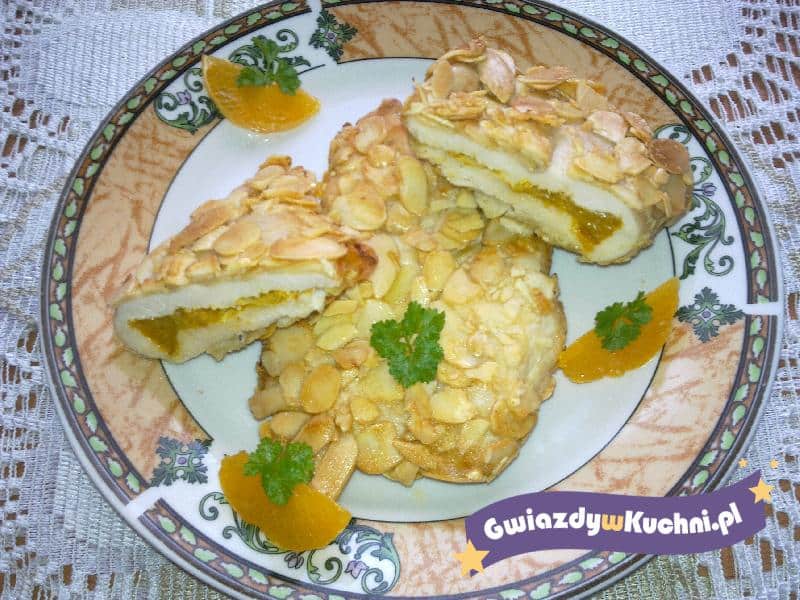 Piersi przekroić na dwa płaty i delikatnie z jednej i drugiej strony przyprawić solą i pieprzem. Z jednej strony posypać przyprawą do kurczaka, przykryć folią spożywczą i wstawić do lodówki na 10 minut. Na każdy płat mięsa kładziemy wycięte fileciki z mandarynki i składamy na pół przyciskając brzegi. Panierujemy w mące, moczymy w białku i panierujemy w płatkach migdałowych. Smażymy na rozgrzanym tłuszczu, na średnim ogniu, na złoty kolor.
