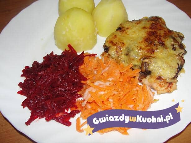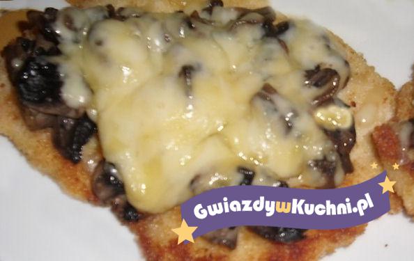 Piersi potłuc tłuczkiem, przyprawić obtoczyć w jajku i bułce usmażyć. Wyłożyć w naczyniu żaroodpornym wyłożyć na nie pieczarki i posypać startym serem, zapiekać z 10 minut.
