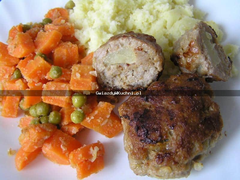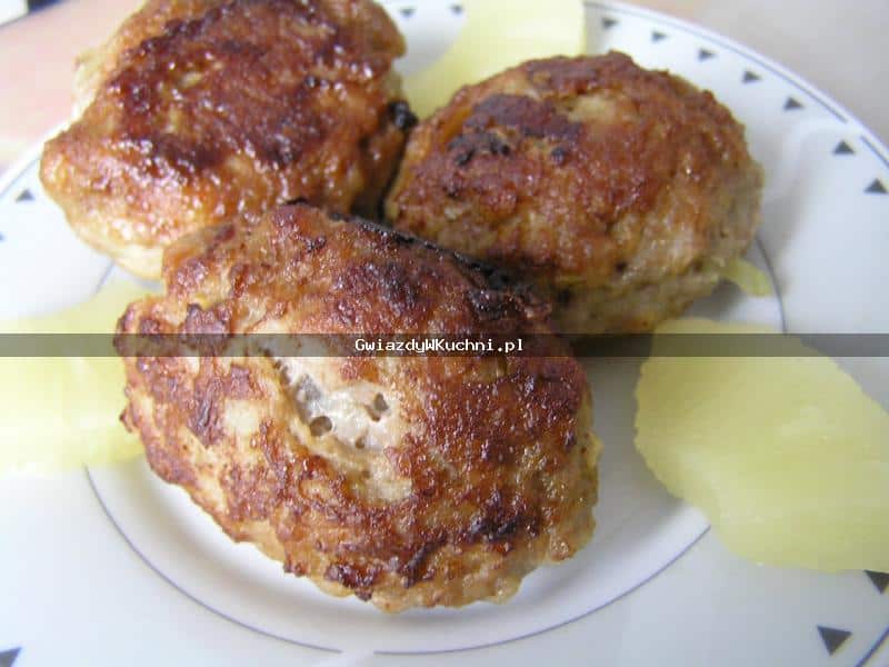 Bułkę namaczamy, odciskamy i dodajemy do mięsa. Cebulę i czosnek obieramy i drobno siekamy. Wbijamy jajko, mieszamy składniki, doprawiamy przyprawami. Formujemy zgrabne kotleciki i wkładamy do środka kawałki ananasów. Obtaczamy w bułce tartej. Smażymy na złoty kolor.