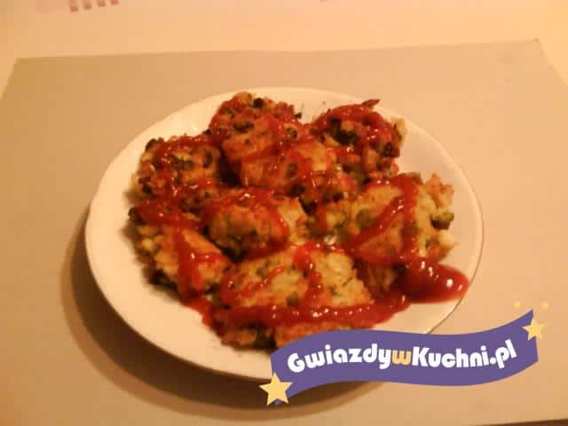 Ryż ugotować na półsypko. Cebulę obrać, posiekać i podsmażyć na oleju. Groszek odsączyć z zalewy. Do ugotowanego ryżu dodać jajko, podsmażona cebulę, groszek, natkę pietruszki, słodką paprykę w proszku, żółty ser, doprawić do smaku pieprzem i solą, dokładnie wymieszać. Z masy formować kotlety, obtaczać w bułce tartej i smażyć na złoty kolor. Po wyjęciu na talerz polać keczupem.