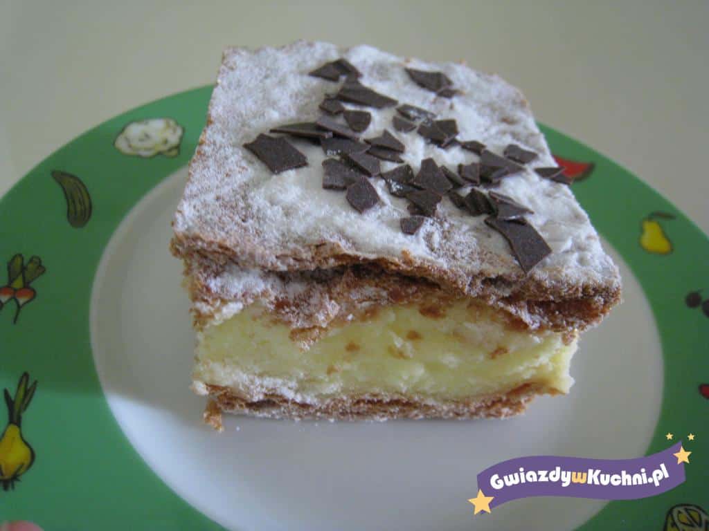 Ciasto francuskie rozmrozić. Podzielić na 3 części, każdą rozwałkować na rozmiar blachy i osobno podpiec około 20 min w temp 220stc. Budyń ugotować wg przepisu na opakowaniu, dodać cukier, a następnie schłodzić. Masło utrzeć na puszystą masę, dodając do niego po łyżce budyniu. Kremówkę ubić z cukrem pudrem i śmietan-fixem. Na wystudzone ciasto rozłożyć budyniowy krem, przykryć płatem ciasta, posmarować bitą śmietaną i nakryć ciastem. Ozdobić.