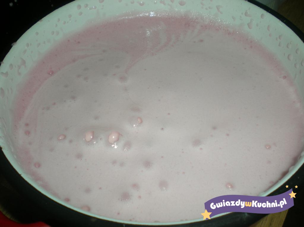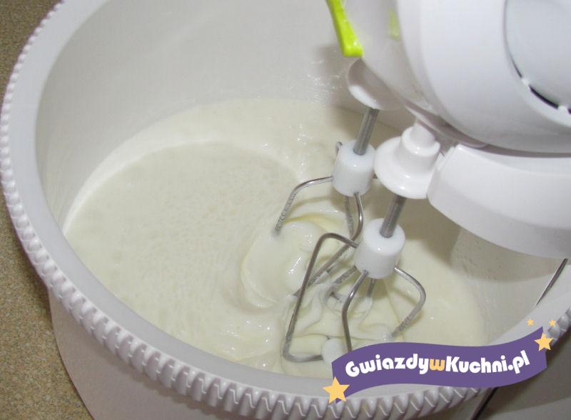 W wodzie rozpuścić galaretkę i bardzo dokładnie wymieszać. Potem na chwilę odstawić. Śmietanę ubić na gęstą i puszystą masę. Oddzielnie ubić białka z cukrem pudrem. Potem połączyć ją chłodną i płynną galaretką i dodać ubitą śmietanę. Wszystkie składniki delikatnie i dokładnie wymieszać, a następnie od razu rozłożyć do pucharków. Wstawić do lodówki na kilka godzin.