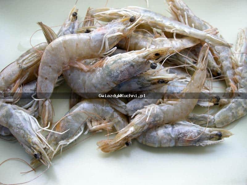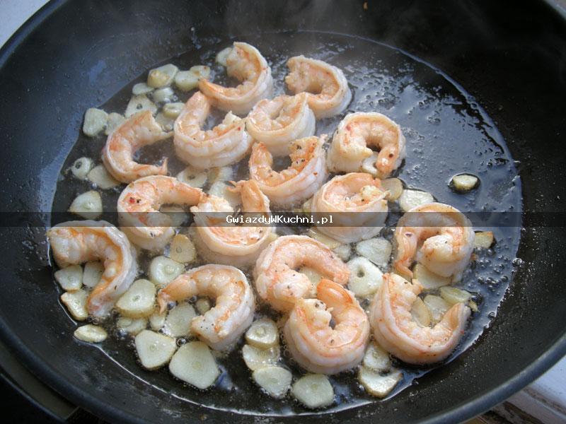 Czosnek pokroić w plasterki i wrzucić na rozgrzany olej, dodać odsączone z marynaty krewetki smazyc aż zmienia kolor na różowy.