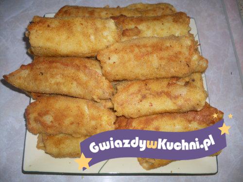 Ze składników przygotowujemy ciasto, mieszając wszystko mikserem. Smażymy naleśniki. Kapustę gotujemy do miękkości z listkiem laurowym, zielem , pieczarki smażymy z cebulką przyprawiamy solą i pieprzem. Ugotowaną kapustę kroimy, mieszamy z pieczarkami i podsmażamy na patelni doprawiając do smaku. Naleśniki nadziewamy farszem, zwijamy, smażymy w mące, jajku i bułce na rumiano.
