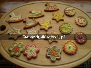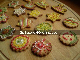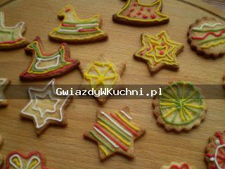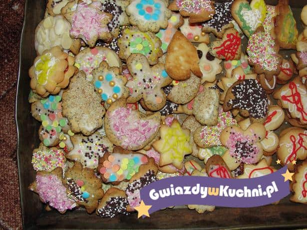 Ze wszystkich składników zagnieść ciasto, zawinąć w folię i odstawić na 1 godzinę do lodówki. Następnie odrywać po kawałku i rozwałkować na grubość 4-5 mm. Wycinać różnokształtnymi foremkami ciasteczka i piec w nagrzanym do 170st piekarniku na złoty kolor. Można posypać cukrem pudrem lub udekorować specjalnymi pisakami.