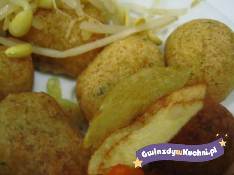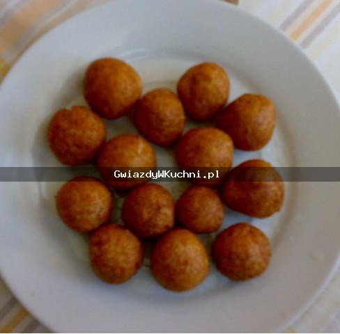 Do miski wsypać bułkę tartą, wlać ciepłą wodę. Dodać żółtka i przyprawić do smaku solą i pieprzem (można dodać posiekany koperek lub natkę pietruszki).Dłońmi formować małe kulki i smażyć na głębokim oleju.