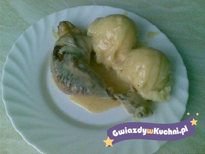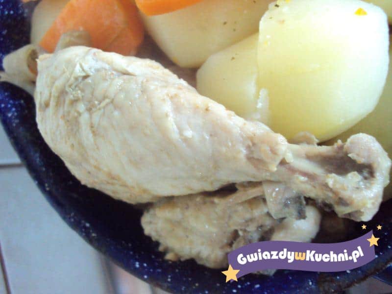 Kurczaka umyć, osuszyć, pokroić na porcje. Na głębokiej patelni rozgrzać olej. Partiami wkładać porcje kurczaka (skórką do dołu), rumienić na średnim ogniu. Z każdej strony smażyć 7 minut. Przełożyć na półmisek. Z patelni zlać nadmiar tłuszczu. Wrzucić obraną i pokrojoną w plasterki cebulę, posypać łyżeczką soli. Smażyć, aż cebula nieco zmięknie. Dodać posiekany czosnek i tymianek. Podgrzewać razem minutę. Wlać wino, dokładnie wymieszać, doprowadzić do wrzenia i gotować kilka minut. Porcje kurczaka przełożyć na patelnię. Dodać oliwki, liść laurowy i pieprz do smaku. Podgrzewać na małym ogniu 20-30 min. Gdy mięso będzie miękkie, przełożyć je na talerze. Do sosu na patelni dodać sok z cytryny i masło, wymieszać, doprawić. Polać porcje kurczaka. Przybrać plasterkami cytryny.
