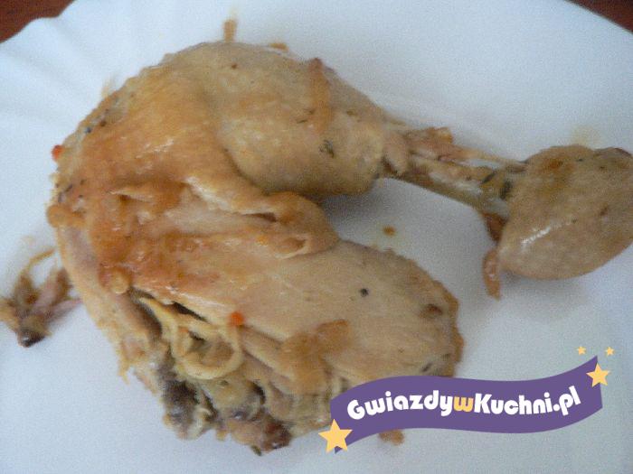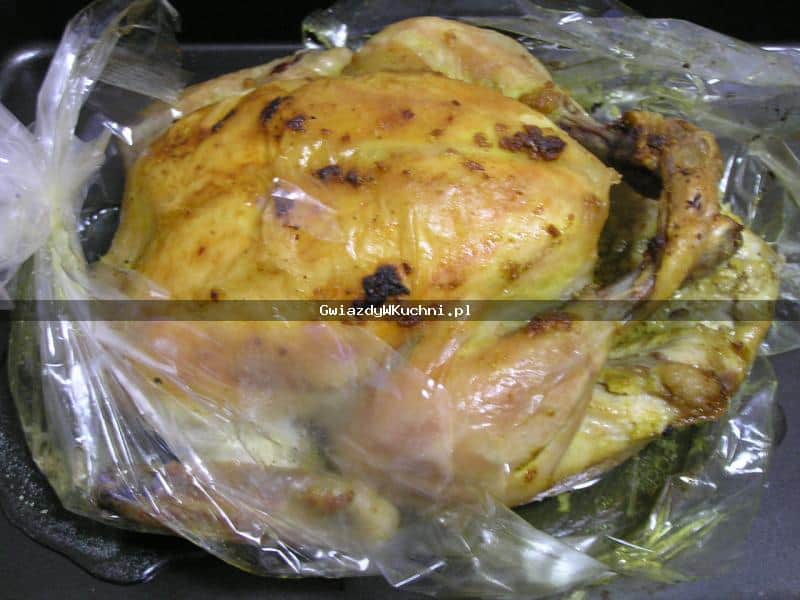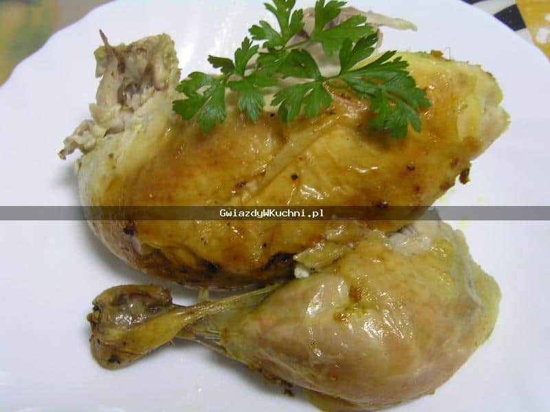 Kurczaka dokładnie umyć i osuszyć. Czosnek obrać, przepuścić przez praskę, wymieszać z oliwą, solą, pieprzem i curry. Natrzeć kurczaka marynatą z wierzchu i w środku. W środku musi być więcej czosnku. Odstawić w chłodne miejsce na 2,3 godziny by składniki marynaty wymieszały się z mięsem i nabrały zapachu czosnku. Piec w rękawie w 180 stopniach od 1 godziny do 1,20 minut w zależności od wielkości kurczaka.
