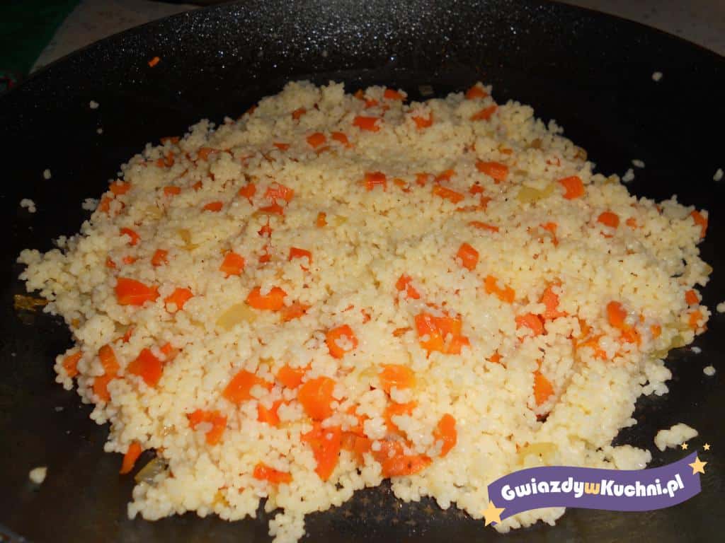 Kaszę przygotować według przepisu podanego na opakowaniu. Marchewkę i cebulę obrać i pokroić w drobną kostkę. Cebulę podsmażyć razem w wyciśniętym przez praskę czosnkiem na patelni na rozgrzanym oleju a następnie dodać pokrojoną marchewkę. Całość podsmażać do czasu aż marchewka będzie miękka (można dodać odrobinkę wody). Kiedy marchewka będzie gotowa dodać do niej kus kus, doprawić solą i pieprzem a następnie wszystko razem wymieszać.